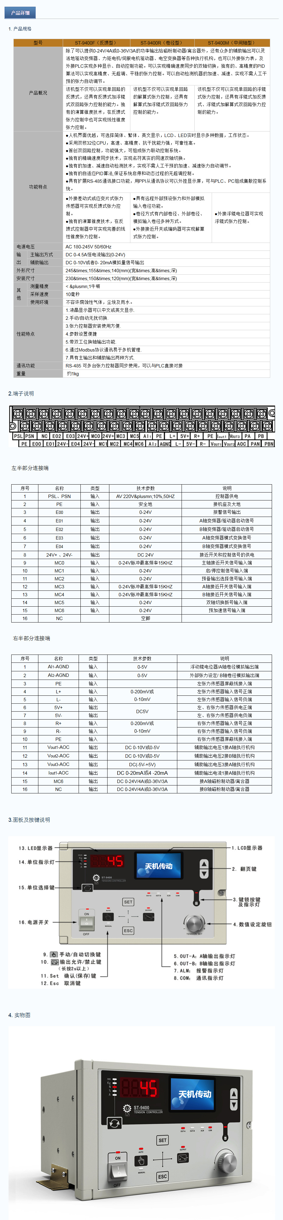 ST-9400智能張力控制器是由張力傳感器直接測定料帶的實際張力值,然后把張力數(shù)據(jù)轉(zhuǎn)換成張力信號反饋回張力控制器,通過此信號與控制器預(yù)先設(shè)定的張力值對比,計算出控制信號,自動控制執(zhí)行單元則使實際張力值與預(yù)設(shè)張力值相等,以達到張力穩(wěn)定目的。它是目前較為先進的張力控制方法。另外,在我國制造和銷售的中、高檔印刷機張力控制系統(tǒng)中,由于更高的印刷速度及生產(chǎn)工藝對張力控制提出了更高的要求,使得磁粉離合器已不能勝任該類系統(tǒng)的執(zhí)行單元。因此在現(xiàn)代凹印機、高速分切機、高速涂布復(fù)合機中已被交、直流伺服電機執(zhí)行單元所取代,實現(xiàn)了更加先進的張力伺服控制。